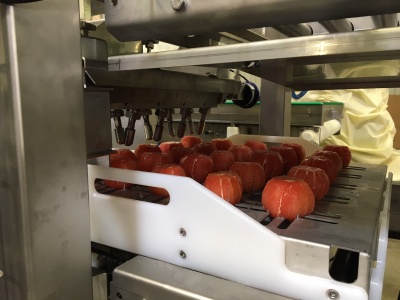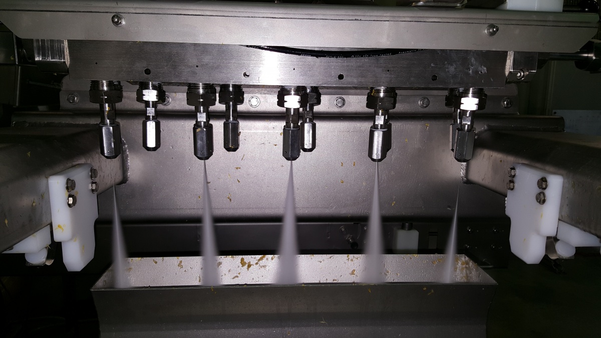 Once peeled, the citrus fruits are loaded onto trays. They are then conveyed to the pure water jet cutting area equipped with 20 heads (10 horizontal and 10 vertical). A 6-axis robot is used to rotate the loaded plate and to cut cubes or slices. The next step in citrus processing is the unloading of the pieces onto a final conveyor. Finally, the fruits are sorted and packed.