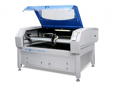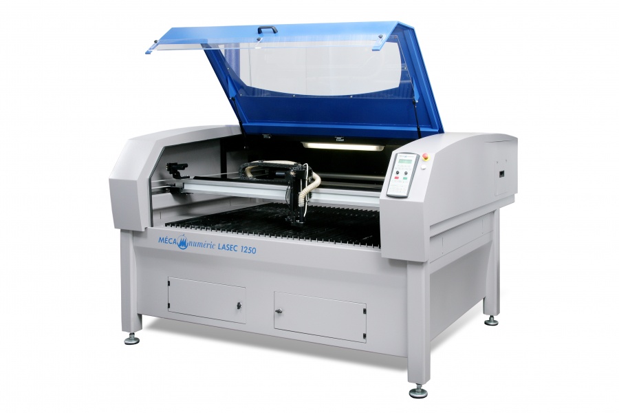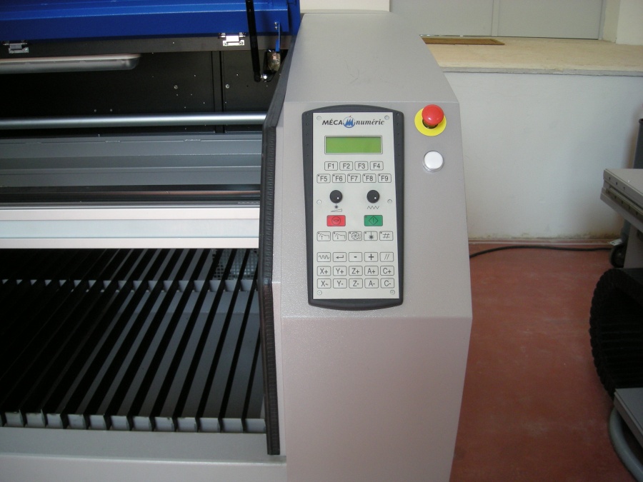 Fixed table, mobile gantry, fixed laser and mobile mirrors. This equipment can realize cutting in vectorial mode and engraving in raster mode.